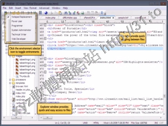 環境選擇器 - 提供預定義的或用戶創建的編輯「環境」,能記住 UltraEdit 的所有可停靠窗口、工具欄等的狀態,方便用戶使用。